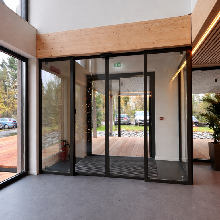 Automatische Schiebetüranlage für moderne Eingangsbereiche. Sorgt für komfortablen       Zugang, effiziente Personenführung und ein professionelles Erscheinungsbild.