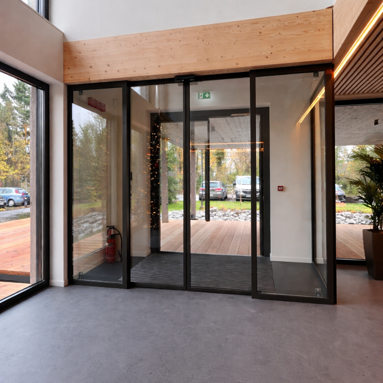 Automatische Schiebetüranlage für moderne Eingangsbereiche. Sorgt für komfortablen       Zugang, effiziente Personenführung und ein professionelles Erscheinungsbild.